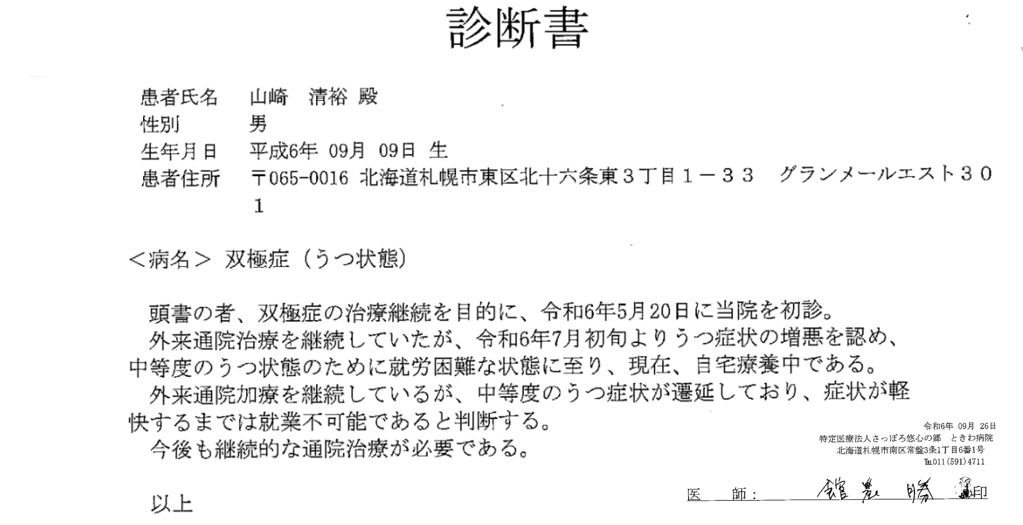 私は精神科医として、心の奥底に潜む闇を見抜く術を学びました。しかし、それは患者を救うためだけに使われるものではありません。時にその知識は、自らのために、そして世の中を巧みに渡るための武器ともなり得ます。診断書――それはただの紙切れ一枚に見えますが、そこに記された言葉には重みがあります。法の網をすり抜ける「免罪符」としての力が、そこに宿るのです。 これまでもお世話になった札幌医科大学や砂川市立病院をはじめとしたたくさんの病院やクリニックを欺いて大胆かつ太々しく退職してきました。精神科医の親友である天才「山本雄才」はいつも困ったときは「どんどん診断書を書いてもらえ」と助言してくれます。そうそう、上掲の診断書もまさに天才精神科医「山本雄才」がアドバイスしてくれたんです。やってることはクソ以下ですよね。笑